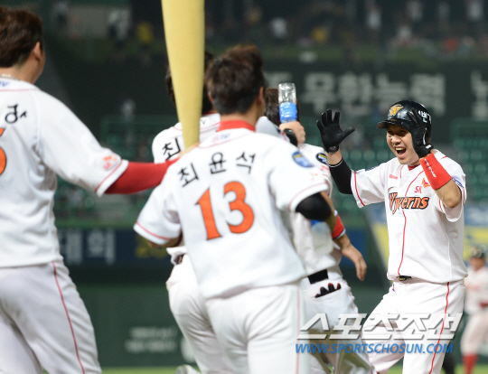 SK가 환화에 끝내기 승을 거두며 3연승을 달렸다. 한화 이글스와 SK 와이번스의 2013 프로야구 경기가 28일 인천구장에서 열렸다. 3-3 동점인 9회말 1사 만루에서 SK 박진만이 끝내기 희생플라이를 친 후 동료들의 축하세례를 받고 있다.