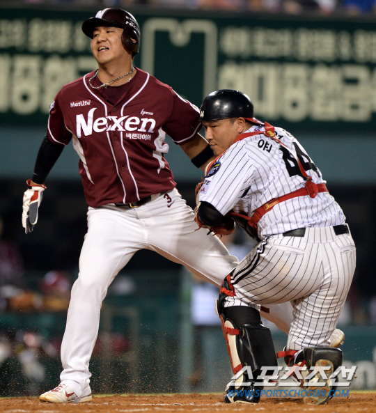 상황은 이랬다. 1-0으로 앞서가던 4회 2사 만루. 허도환 타석 때 2루 주자 서동욱이 깊은 리드로 투수의 견제를 유도하는 사이 3루 주자가 홈으로 쇄도하는 주루플레이를 시도했다. 지난 7월5일 경기 9-9 동점이던 8회 2사 만루 때 LG 봉중근의 2루 견제를 유도해 결승점을 뽑아냈던 장면을 다시 보는듯한 기시감. 하지만 결과는 정반대였다. LG는 두번 속지 않았다. 우규민이 2루에 송구하는 척 하면서 멈춘 뒤 홈에 던져 3루주자 김민성이 태그 아웃.