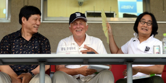 | 고양 원더스 허민(오른쪽) 구단주의 초청으로 한국을 방문한 미국 메이저리그의 전설적인 너클볼러 필 니크로(73세) 잠실 야구장을 찾아 경기를 지켜보고 있다. 잠실=조병관기자 rainmaker@sportschosun.com/2012.08.09/ |