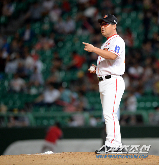 SK와 삼성의 2013 프로야구 주중 2연전 첫번째날 경기가 29일 인천 문학구장에서 열렸다. 8회초 투수교체를 위해 마운드에 오른 SK 이만수 감독이 야수들을 격려하고 있다. 인천=허상욱 기자 wook@sportschosun.com