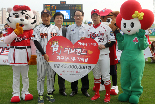 KIA 타이거즈와 기아자동차는 30일 광주 넥센전에 앞서 '타이거즈 러브펀드 장학금' 전달식을 갖고 야구 꿈나무들에게 꿈과 희망을 심어줬다. 이날 전달된 장학금은 지난해 '타이거즈 러브펀드'를 통해 적립한 기금 중 일부인 4500만원.
