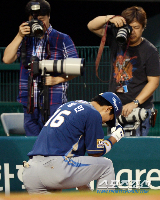 전날 뼈아픈 패배를 당했던 두산이 21일 설욕전을 위해 NC와 잠실에서 만났다. NC 모창민이 2회초 좌중월 솔로 홈런을 터뜨리고 무릎을 꿇는 세리머니를 하고 있다. 잠실=조병관기자 rainmaker@sportschosun.com