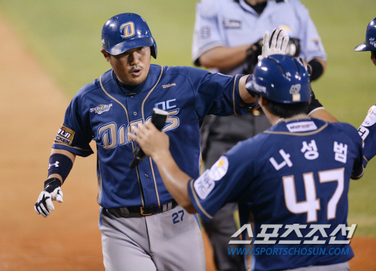 전날 뼈아픈 패배를 당했던 두산이 21일 설욕전을 위해 NC와 잠실에서 만났다. NC 이호준이 8회 1사 1,2루에서 좌중월 스리런 홈런을 치고 나성범과 하이파이브를 하고 있다. 이호준의 연타석 홈런. 잠실=김기범 인턴기자/2013.08.21/ |