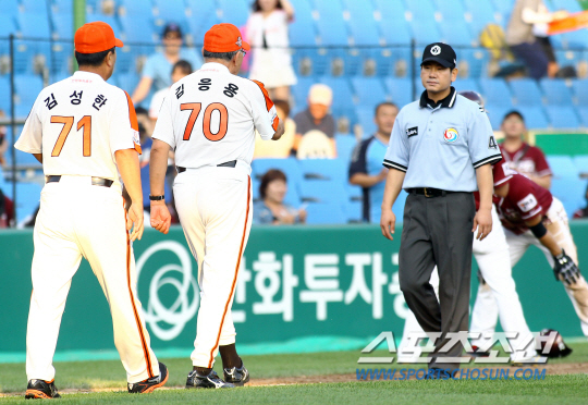 한화는 1일 대전에서 열린 넥센과의 경기에서 석연치 않은 판정 때문에 뼈아픈 패배를 당했다. 3-3 동점이던 3회초 수비 1사 1루서 넥센 박병호의 좌중간 안타때 1루주자 이택근이 3루에서 세이프되면서 상황이 꼬였다. 3루수 이대수의 태그가 빨랐지만, 3루심은 세이프를 선언했다. 김응용 감독이 이례적으로 그라운드로 나가 어필을 했을 정도로 아쉬운 순간이었다. 결국 한화는 상대 김민성에게 희생플라이를 내주면서 3-4의 리드를 빼앗겼고, 결국 3대7로 패했다.