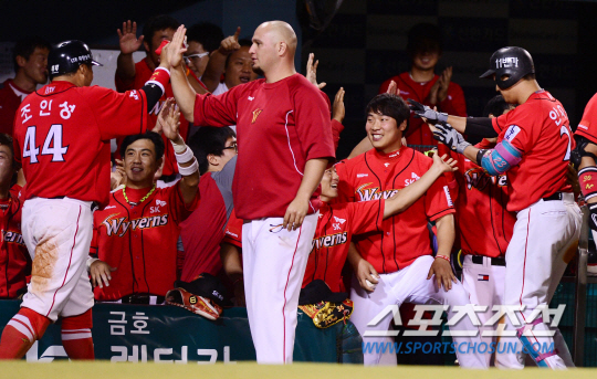삼성과 치열한 선두 다툼을 벌이고 있는 LG와 포스트시즌 진출의 희망을 갖고 있는 SK가 3일 잠실에서 만났다. SK 9회초 1사 2,3루에서 대타로 나와 역전 적시타를 친 안치용(오른쪽)과 역전 득점을 올린 조인성이 동료들과 하이파이브를 하고 있다. 잠실=조병관기자 rainmaker@sportschosun.com/2013.09.03/ |