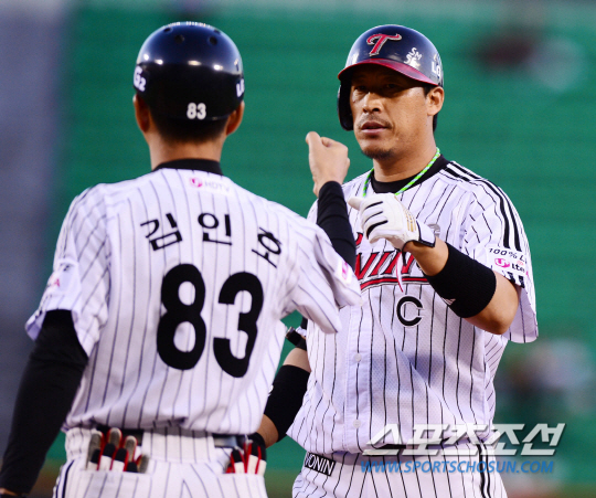 삼성과 치열한 선두 다툼을 벌이고 있는 LG와 포스트시즌 진출의 희망을 갖고 있는 SK가 3일 잠실에서 만났다. LG 이병규가 1회말 2사 1,3루에서 적시타를 치고 김인호 코치와 하이파이브를 하고 있다. 잠실=조병관기자 rainmaker@sportschosun.com