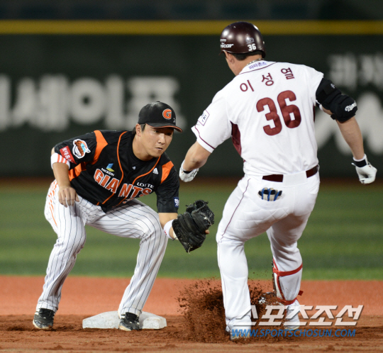 2.5게임차로 4위와 5위를 달리고 있는 넥센 히어로즈와 롯데 자이언츠가 4일 목동구장에서 맞붙었다. 2회말 1사 1,2루 넥센 이성열이 중견수앞 1타점 안타를 치고 2루에서 아웃되고 있다. 목동=정재근기자 cjg@sportschosun.com