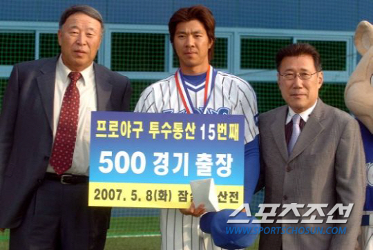 | 임창용의 프로 첫 스승인 한화 김응용 감독은 그의 메이저리그 성공 조건으로 스트라이크존 적응을 꼽았다. 삼성 시절인 2007년 김응용 사장과 임창용, 하일성 KBO 사무총장. 스포츠조선 DB |