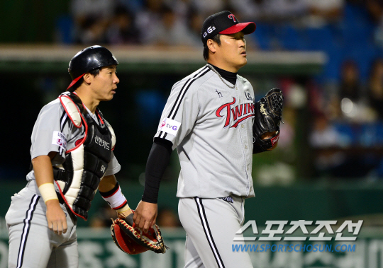 | LG 정현욱이 6일 1군에서 제외됐다. 이유는 최근 부진이다. 5일 대전 한화전서 7회 마운드에 오른 정현욱이 폭투로 인해 첫 실점을 허용한 뒤 포수 현재윤의 위로를 받고 있다. 송정헌 기자 songs@sportschosun.com |