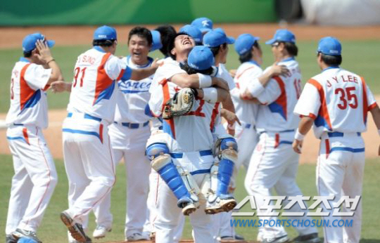 | 야구가 2020년 도쿄올림픽 정식종목으로 다시 채택될 가능성이 낮은 것으로 알려졌다. 지난 2008년 베이징올림픽에서 금메달을 따낸 한국 야구대표팀. 스포츠조선 DB |