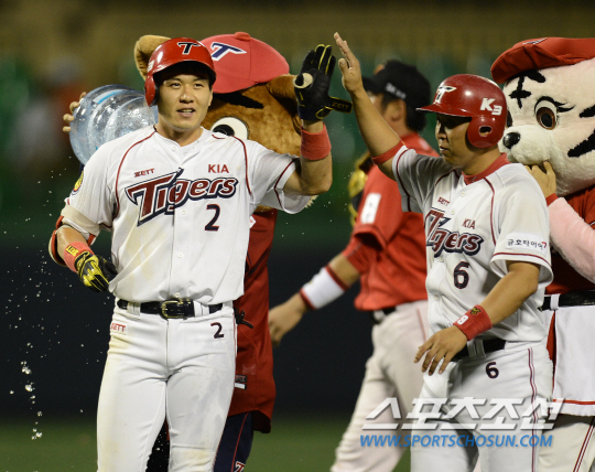 SK 와이번스와 KIA 타이거즈의 2013 프로야구 경기가 11일 군산구장에서 열렸다. 1-1로 팽팽한 접전이 벌어진 9회말 2사 만루 KIA 신종길이 끝내기 우전안타를 치자 동료들이 환호하며 신종길을 향해 달려들고 있다. 군산=정재근기자 cjg@sportschosun.com/2013.09.11/ |
