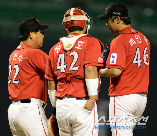 | SK 이만수 감독이 11일 군산 KIA전서 7회 2사후 마운드로 올라와 백인식을 교체하고 있다. 군산=정재근기자 cjg@sportschosun.com |