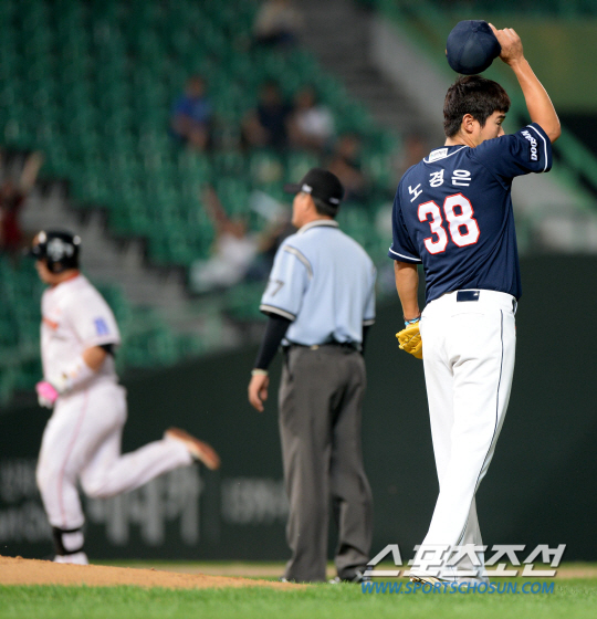 올 시즌 상대 전적 7승 7패로 팽팽하게 맞서고 있는 SK와 두산의 주중 2연전 첫번째 경기가 12일 인천 문학구장에서 열렸다. 2회말 2사 1루 SK 정상호가 두산 노경은의 투구를 받아쳐 좌측담장을 넘어가는 2점홈런을 날렸다. 홈런을 허용한 노경은이 땀을 닦아내며 아쉬워하고 있다. 인천=허상욱 기자 wook@sportschosun.com/2013.09.12/