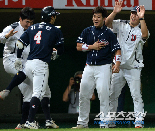 그라운드에 긴장감이 돌기 시작했다. 결국 SK 벤치는 마무리 박희수를 마운드에 올렸다. 오재원의 기습번트가 내야안타가 됐다. 하지만 김재호가 중견수 플라이, 박건우가 삼진으로 물러났다. 경기는 이대로 끝나는 듯 했다. 하지만 민병헌이 다시 중전안타를 치며 추격의 물꼬를 트기 시작했다. 타석에는 김현수의 교체로 들어선 김동한. 2B 1S에서 박희수의 투심이 가운데로 몰렸다. 김동한은 그대로 받아쳐 좌측 펜스를 넘겨버렸다. 데뷔 첫 홈런. 그것도 결승홈런이었다.