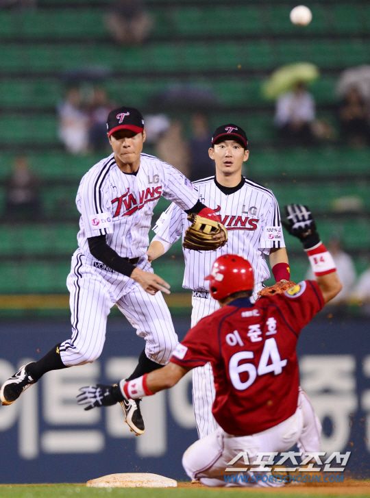 12일 잠실 야구장에서 펼쳐진 LG와 KIA경기에서 KIA 7회초 1사 1,3루 홍재호 땅볼타구를 LG 유격수 권용관이 잡아 2루 베이스 터치후 1루에 던져 병살을 성공 시키고 있다. 잠실=조병관기자 rainmaker@sportschosun.com |