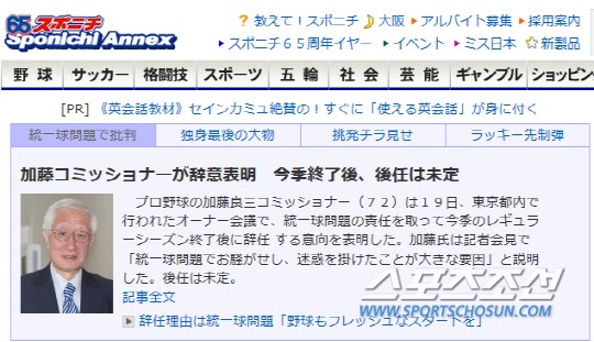 | NPB 가토 커미셔너의 사임을 보도한 스포츠닛폰 홈페이지. |
