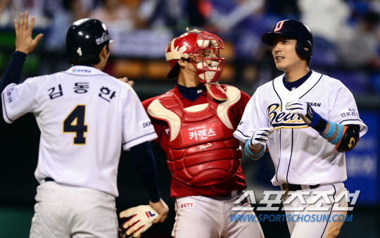 선두권 도약을 노리는 두산과 전날 패배를 설욕 하려는 KIA가 22일 잠실에서 다시 만났다. 두산 7회말 2사 1,3루에서 김재호가 좌중월 3점 홈런을 치고 김동한과 하이파이브를 하고 있다. 잠실=조병관기자 rainmaker@sportschosun.com/2013.09.22/