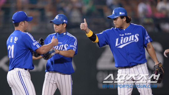 | 21일 오후 서울 목동야구장에서 2013 프로야구 삼성과 넥센의 경기가 열렸다. 8대6으로 승리한 삼성 오승환 등 선수들이 마운드 위에서 하이파이브를 나누고 있다. 목동=김경민 기자 kyungmin@sportschosun.com / 2013.09.21. |