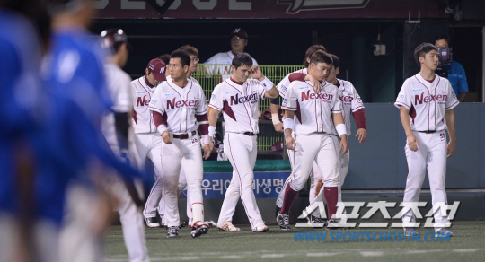 | 21일 오후 서울 목동야구장에서 2013 프로야구 삼성과 넥센의 경기가 열렸다. 6대8로 패배한 넥센 선수들이 관중들에게 인사하기 위해 마운드로 걸어나오고 있다. 목동=김경민 기자 kyungmin@sportschosun.com / 2013.09.21. |