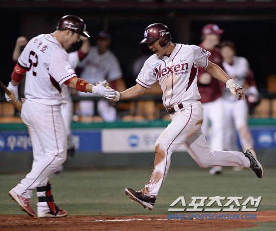 22일 오후 서울 목동야구장에서 2013 프로야구 롯데와 넥센의 경기가 열렸다. 9회말 2사 2루서 2루주자 이택근이 3루 도루를 시도하다 볼이 빠진 틈을 타 홈으로 뛰어들어 박병호와 하이파이브를 나누고 있다. 목동=김경민 기자 kyungmin@sportschosun.com / 2013.09.22. |