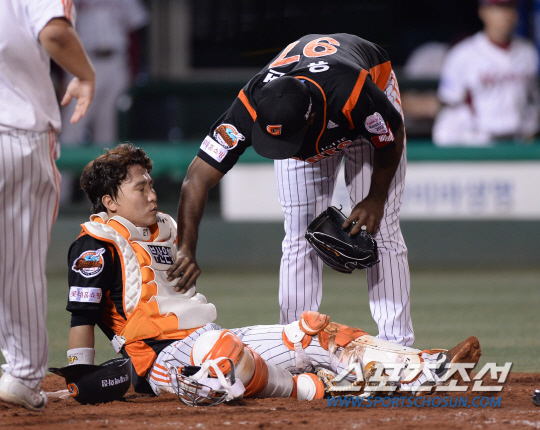 롯데 백업포수 용덕한이 팔꿈치 부상으로 1군 엔트리에서 제외됐다.