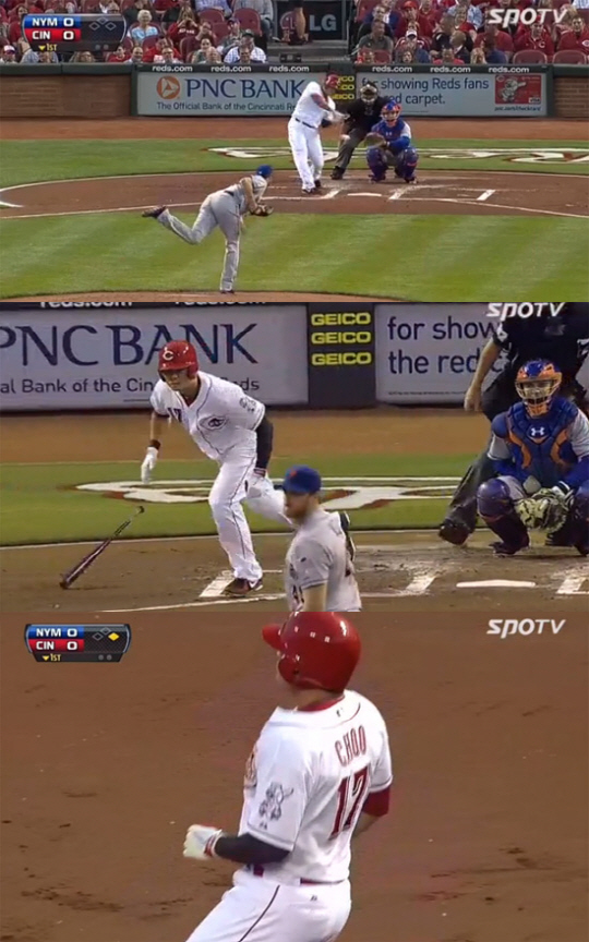 이어 2번타자 브랜든 필립스의 우중간 적시타로 2루까지 진루한 추신수는 1사 1,2루 상황에서 라이언 루드윅이 중전안타를 기록, 3루 주루코치의 사인을 보고 홈으로 돌진했지만 태그아웃 당하며 아쉽게 득점에 실패했다.