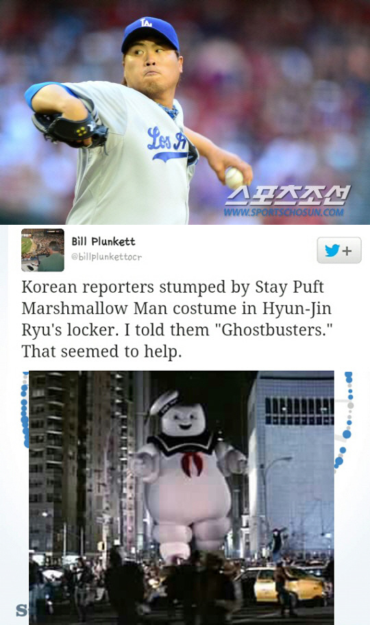 공개된 사진은 LA 지역 일간지 '오렌지 카운티 레지스터'의 빌 플렁켓 기자의 트위터 캡처 사진으로, 해당 SNS에서 빌 플렁켓 기자는 "라커룸 류현진 자리에 영화 '고스트 버스터즈' 마시멜로맨 코스튬이 걸려있다"는 글을 남겼다. 사진 속 마시멜로맨의 퉁퉁한 몸과 장난기 넘치는 표정 등이 류현진과 흡사해 그의 변신에 야구팬들의 궁금증이 쏠리고 있다.