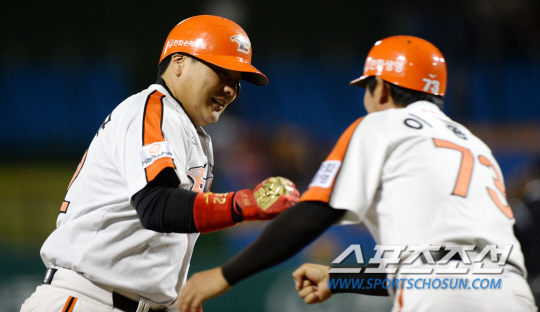 최하위 한화와 1위 재도약을 노리는 LG가 만났다. 25일 대전구장에서 열린 한화와 LG의 경기에서 7회말 2사 1,3루 한화 김태균이 LG 정현욱의 투구를 받아쳐 좌측담장을 넘어가는 3점홈런을 날렸다. 베이스를 돌며 이종범 3루 코치와 기쁨을 나누는 김태균. 대전=허상욱 기자 wook@sportschosun.com/2013.09.25/ |