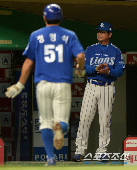 24일 인천문학구장에서 프로야구 SK와 삼성의 경기가 열렸다. 2회 2사 2루에서 삼성 정형식이 박한이의 적사타 때 득점에 성공했다. 덕아웃에서 류중일 감독의 박수를 받고 있는 정형식. 인천=송정헌 기자 songs@sportschosun.com