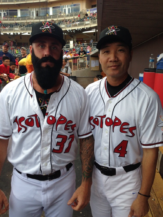 LA 다저스 산하 트리플 A 앨버버키 유니폼을 입고 지난달 초 함께한 투수 브라이언 윌슨과 한용덕 코치. 샌프란시스코에서 다저스로 이적한 윌슨은 앨버커키에서 구위를 체크한 뒤 메이저리그에 합류했다. 사진제공=한용덕 한화 코치