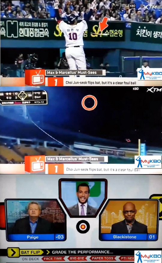 ESPN의 베이스볼쇼 진행자는 "명백하게 파울을 쳤는데도 배트를 던지고 두 손을 번쩍 들었다"면서 폭소를 터뜨리며 명장면 1위에 올려놨다.