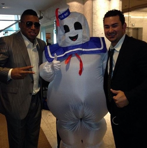 공개된 사진에는 벨리사리오와 아드리안 곤잘레스(31)사이에서 오른손 엄지 손가락을 들고 있는 마시멜로맨의 모습이 담겨있다.