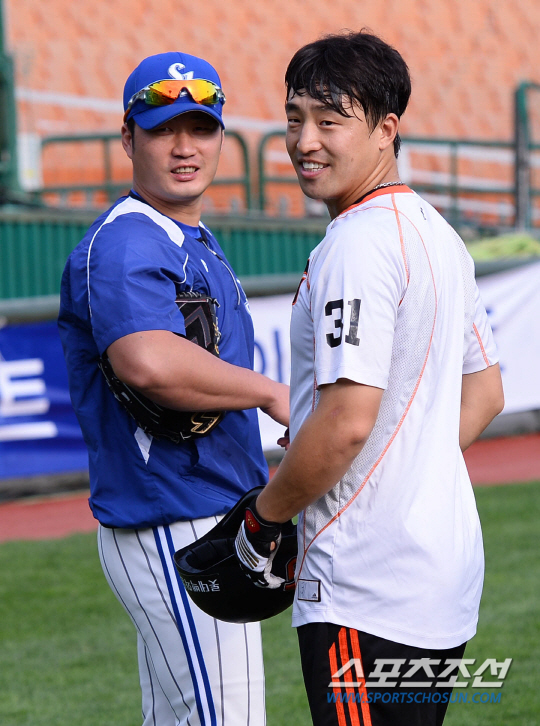 롯데 자이언츠 3번 타자 손아섭은 LG 트윈스 베테랑 타자 이병규(9번)과 타격왕 자리를 놓고 치열한 경합을 벌이고 있다. 1일 까지 손아섭(0.344)이 이병규(0.343)에 1리 앞섰다. 2일 경기를 포함 둘 다 3경기씩을 남겨두고 있다. 손아섭은 줄곧 시즌 내내 1위를 달려왔다. 시즌 막판 복병을 만났다. 타석수가 부족했던 이병규가 최근 규정 타석을 채우면서 타격왕 경쟁에 뛰어든 것이다. 롯데 자이언츠와 삼성 라이온즈의 2013프로야구 경기가 2일 부산사직야구장에서 열렸다. 경기전 손아섭이 오승환과 반갑게 인사를 나누고 있다. 손아섭은 27일 대구 삼성전에서 3-3으로 맞선 연장 10회초에 마무리 오승환을 상대로 결승 홈런을 때린바 있다. 부산=최문영 기자 deer@sportschosun.com /2013.10.02/