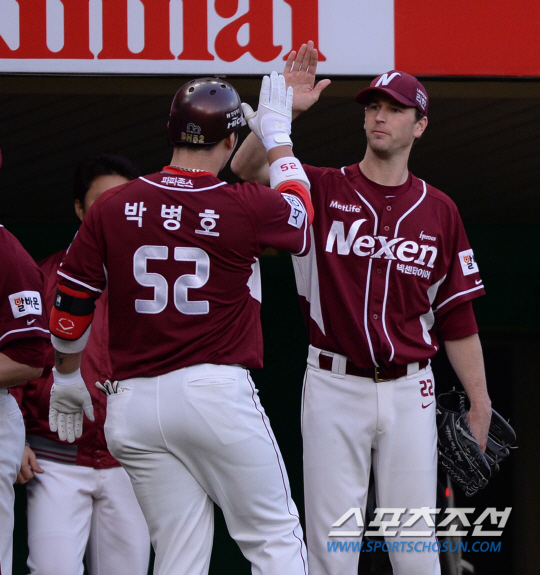 3일 오후 인천 문학야구장에서 2013 프로야구 넥센과 SK의 경기가 열렸다. 3회초 2사 1,3루서 넥센 박병호가 좌월 3점 홈런을 친 후 덕아웃에서 밴헤켄과 하이파이브를 나누고 있다. 인천=김경민 기자 kyungmin@sportschosun.com
