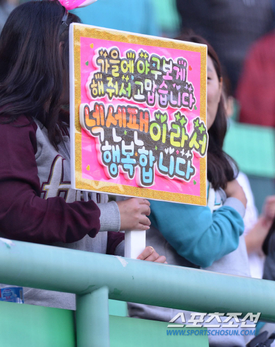 | 3일 오후 인천 문학야구장에서 2013 프로야구 넥센과 SK의 경기가 열렸다. 경기장을 찾은 넥센 팬들이 포스트시즌 진출을 축하하는 플렛카드로 응원을 하고 있다. 인천=김경민 기자 kyungmin@sportschosun.com / 2013.10.03. |