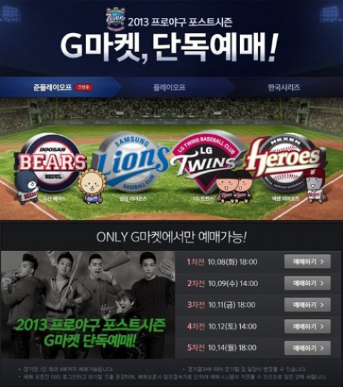 준플레이오프 예매는 'G마켓 티켓(ticket.gmarket.co.kr)'과 '자동응답전화(1644-5703)', '스마트폰 티켓 예매 애플리케이션(G마켓ㆍ티켓링크)'에서 1인당 최대 4매까지 예매할 수 있다. 또 포스트시즌 입장권 단독판매사인 G마켓 홈페이지 검색창에서도 구매할 수 있다.