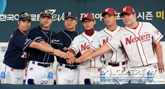 2013 프로야구 준플레이오프 미디어데이가 7일 목동구장에서 열렸다. 미디어데이에는 넥센 염경엽 감독과 박병호, 이택근, 두산 김진욱 감독과 홍성흔, 유희관이 참석해 공식 기자회견을 가졌다. 기자회견에 참석한 넥센 염경엽 감독과 두산 김진욱 감독을 비롯한 대표선수들이 포즈를 취하고 있다. 목동=허상욱 기자 wook@sportschosun.com/2013.10.07/