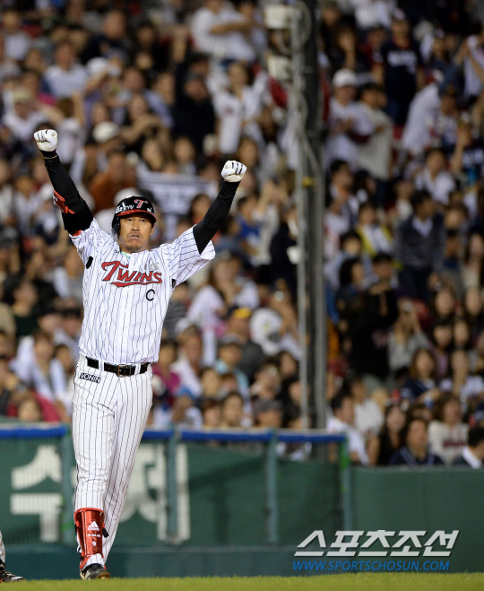 플레이오프 직행을 노리며 반게임차 3-4위를 달리고 있는 서울라이벌 LG와 두산의 시즌 마지막 경기가 5일 잠실구장에서 열렸다. 6회말 2사 1,3루 LG 이병규가 우익수 오른쪽으로 흐르는 2타점 역전 3루타를 치고 환호하고 있다. 잠실=허상욱 기자 wook@sportschosun.com/2013.10.05/