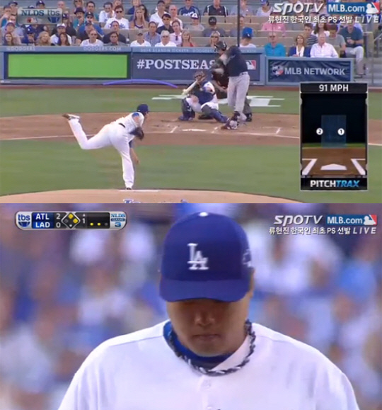 류현진은 7일(이하 한국시간) 미국 캘리포니아주 로스앤젤레스 다저스타디움에서 열린 애틀랜타 브레이브스와 내셔널리그 디비전시리즈 3차전에 선발 등판, 1회초에 2실점하며 불안한 모습을 보였지만 2회초에 세 타자를 연속 잡아내며 안정감을 되찾았다.