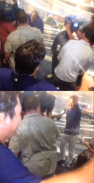 류현진은 인터뷰 중인 돈 매팅리 감독을 향해 샴페인을 조준 발사해 특유의 장난끼를 발휘했다.