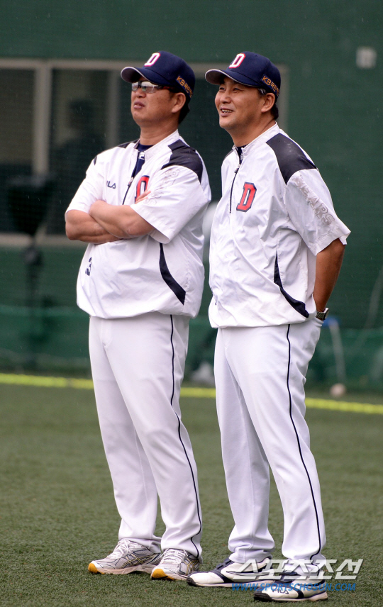 8일 목동구장에서 2013프로야구 준PO 1차전 넥센과 두산의 경기가 열렸다. 구본능 KBO 총재가 참석한 가운데 경기 전 두산 김진욱 감독이 황병일 코치와 함께 선수들의 훈련을 바라보고 있다. 목동=송정헌 기자 songs@sportschosun.com/2013.10.8