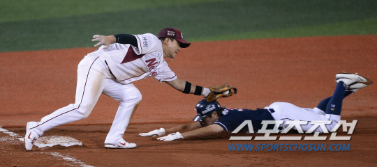 두산 베어스는 '발야구'의 원조다. '두산육상부'라는 말까지 들었다. 두산은 2013시즌 페넌트레이스에서 9팀 중 가장 많은 172개의 도루를 했다. 팀 도루 꼴찌 한화(70개) 보다 무려 100개 이상 많다. 두산의 빠른 발은 상대 팀에 골칫거리 중 하나다. 8일 오후 서울 목동야구장에서 2013 프로야구 준플레이오프 1차전 두산과 넥센의 경기가 열렸다. 4회초 2사 2루서 2루주자 정수빈이 양의지 타석 때 3루도루에 실패하고 있다. 목동= 김경민 기자 kyungmin@sportschosun.com / 2013.10.08. |