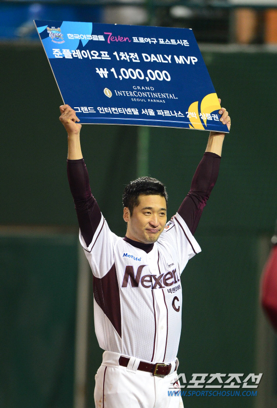 8일 목동구장에서 2013프로야구 준PO 1차전 넥센과 두산의 경기가 열렸다. 경기 MVP에 오른 이택근이 수상하고 있다. 목동=송정헌 기자 songs@sportschosun.com/2013.10.8