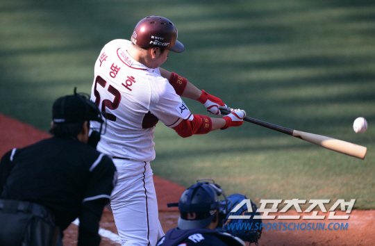1회말 2사 이후 주자없는 상황에서 타석에 들어선 최준석. 넥센 선발 오재원의 공을 그대로 잡아당겼다. 좌측으로 휜 타구는 관중석 상단 지붕을 맞고 튀어올랐다.