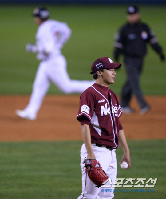11일 오후 서울 잠실야구장에서 2013 프로야구 준플레이오프 3차전 넥센과 두산의 경기가 열렸다. 4회말 2사서 두산 홍성흔에게 좌중월 솔롬 홈런을 허용한 넥센 오재영이 아쉬워하고 있다. 잠실=김경민 기자 kyungmin@sportschosun.com / 2013.10.11.