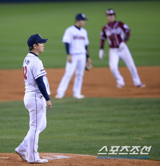 1루 대주자 김지수를 견제하기 위해 바짝 의식하고 있던 윤명준은 1루를 향해 견제구를 던진다는 것이 허공을 가르고 말았다. 송구는 두산 덕아웃 옆 불펜피칭 구역으로 들어갔다.
