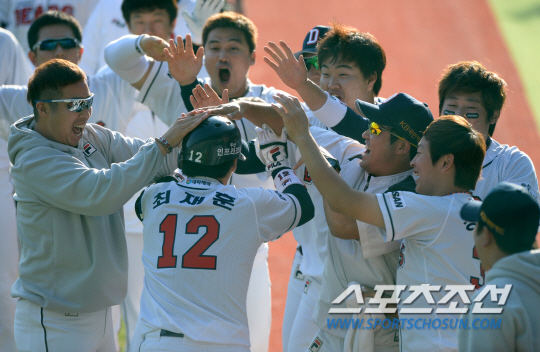 2013 프로야구 준플레이오프 4차전 두산과 넥센의 경기가 12일 잠실구장에서 열렸다. 6회말 1사 1루 두산 최재훈이 넥센 벤헤켄의 투구를 받아쳐 좌중간 담장을 넘어가는 역전 2점홈런을 날렸다. 홈인하며 동료들과 기쁨을 나누는 최재훈. 잠실=허상욱 기자 wook@sportschosun.com/2013.10.12/