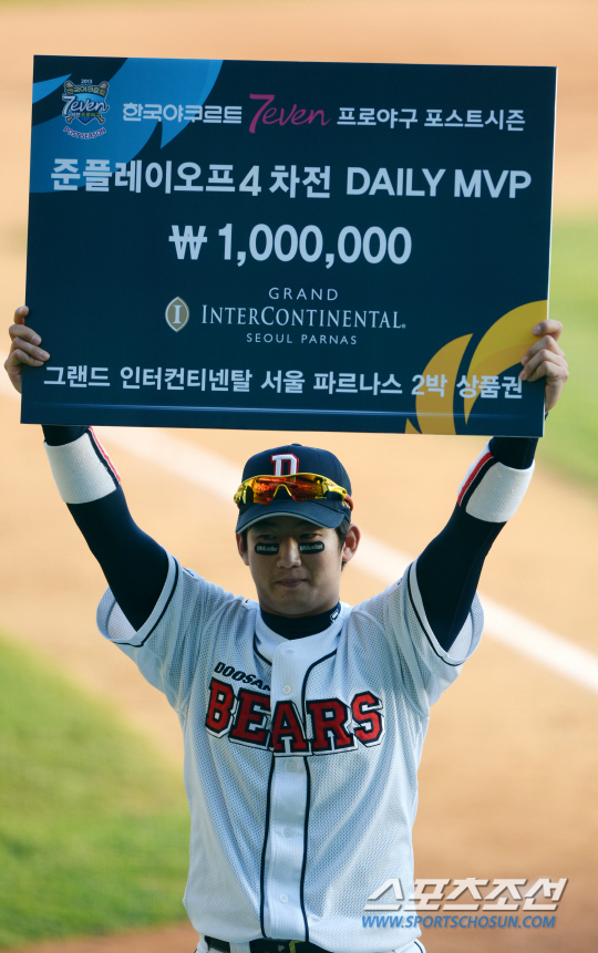 야구계 속설 중 이런 게 있다. '포수에겐 홈런 맞지 마라.' 상대 포수에게 홈런 맞으면 경기가 잘 풀리지 않는다는 걸 뜻한다. 다수의 포수들이 수비 비중이 크기 때문에 다른 포지션의 야수들에 비해 공격에 차지하는 역할이 크지 않다. 게다가 타력이 떨어지는 수비형 포수들에게 홈런은 가뭄에 콩 나듯 귀하다. 따라서 수비형 포수가 홈런을 치는 건 이변 중 하나다. 그런 이변이 포스트시즌 같은 단기전에서 나오면 상대편이 승리할 가능성이 낮을 수밖에 없다. 2013 프로야구 준플레이오프 4차전 두산과 넥센의 경기가 12일 잠실구장에서 열렸다. 두산이 최재훈의 역전 2점홈런에 힘입어 넥센을 2대1로 물리치고 준플레이오프 승부를 5차전으로 이어갔다. 준플레이오프 4차전 MVP로 선정된 두산 최재훈이 포즈를 취하고 있다. 잠실=허상욱 기자 wook@sportschosun.com/2013.10.12/