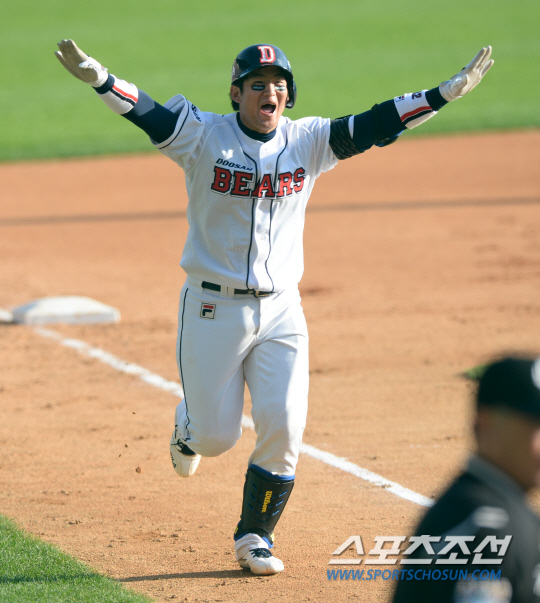 두산 최재훈이 준PO 4차전서 역전 투런포를 날리고 홈으로 들어오는 모습. 잠실=허상욱 기자 wook@sportschosun.com
