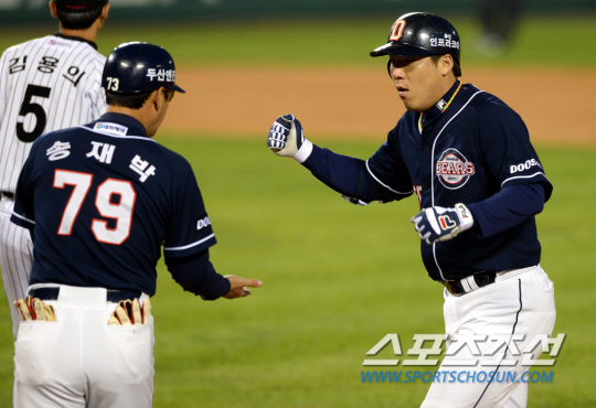 2013 프로야구 플레이오프 1차전 LG와 두산의 경기가 16일 잠실구장에서 열렸다. 1회초 무사 1,3루서 두산 김현수가 우익수 앞 적시타를 치고 기뻐하고 있다. 잠실=허상욱 기자 wook@sportschosun.com